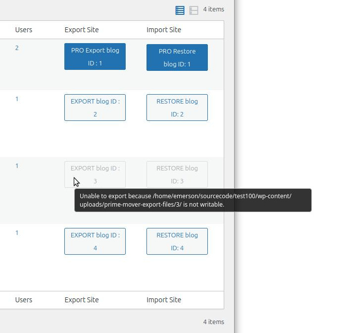 - If you are network-activating Prime Mover in a multisite environment, permission handling is the same as in a single-site environment. In multisite, the subsite export and import buttons are unusable if a permission issue is detected in the assigned export folders. For example: