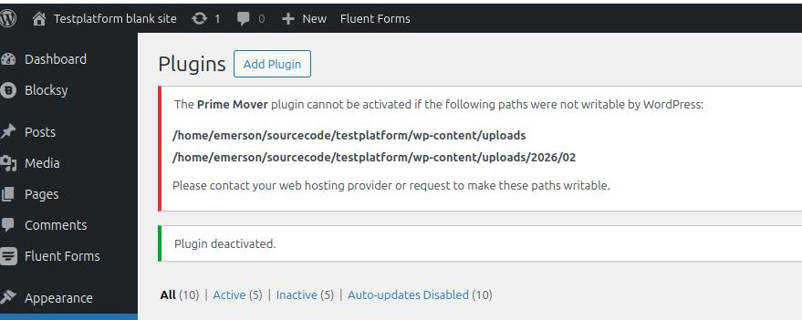 - If serious permission issues are detected, the plugin will automatically deactivate and return an error. For example, let’s assume the uploads directory is not writable: